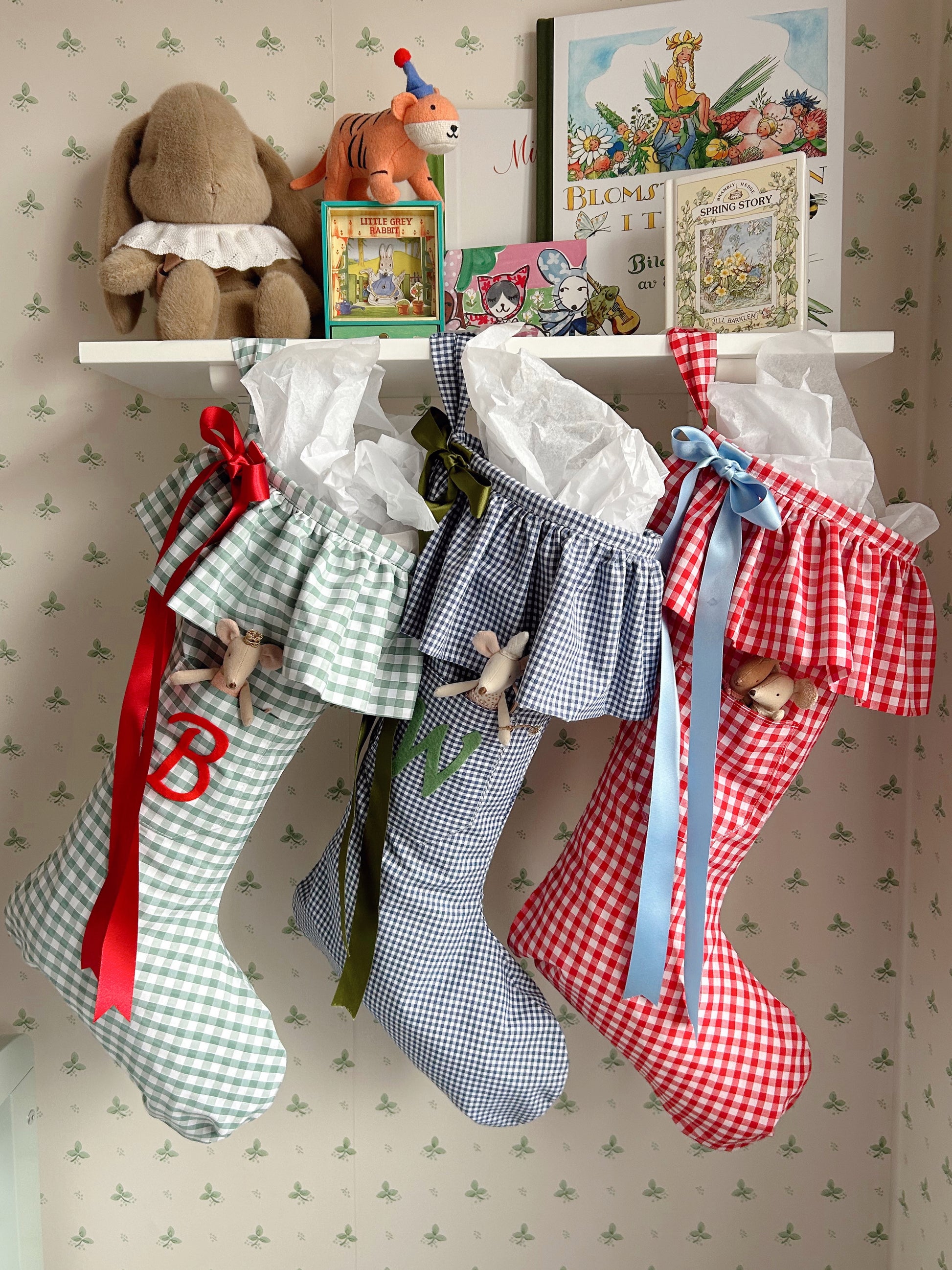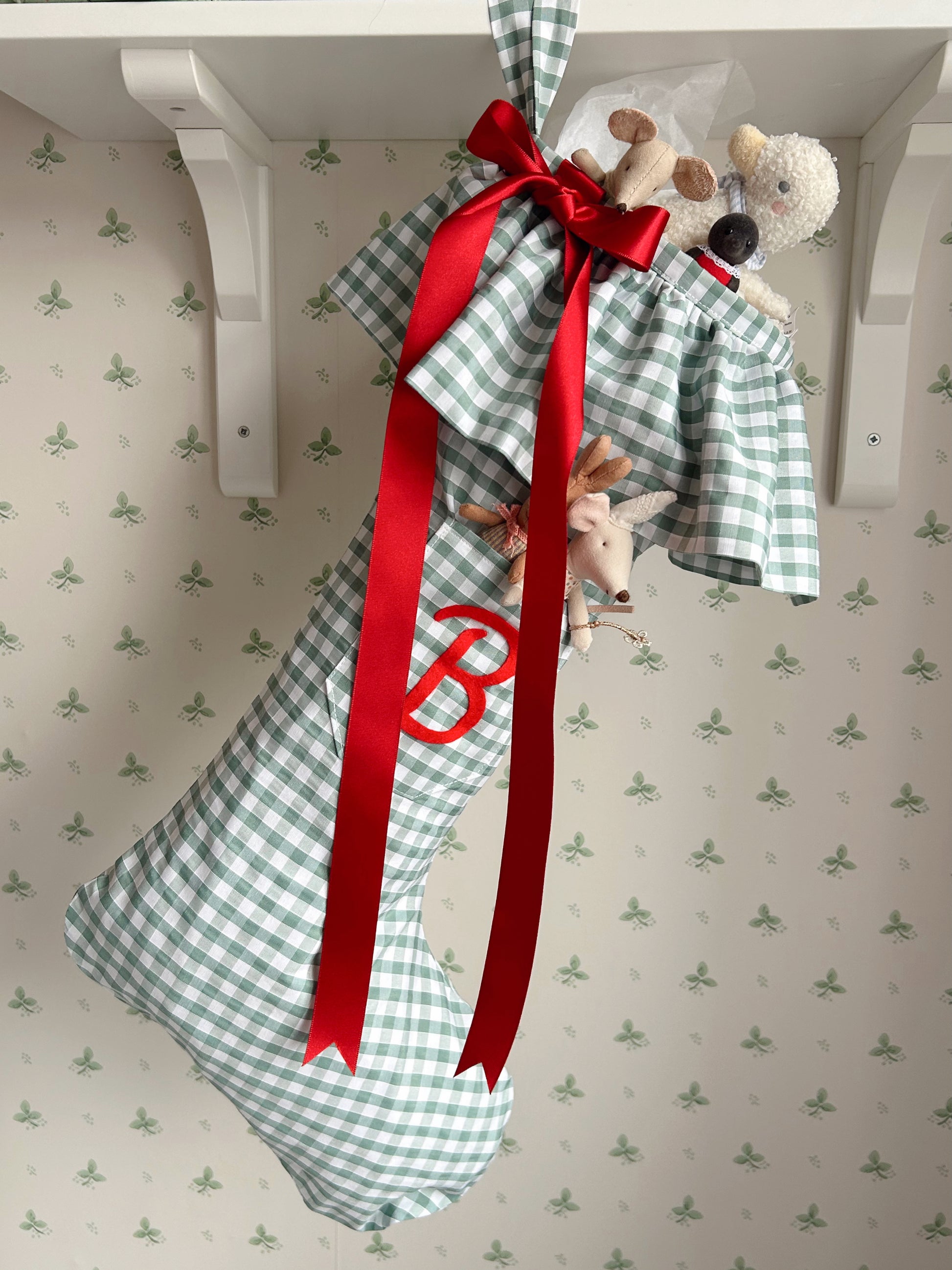 A whimsical and festive stocking featuring a ruffled edge and monogram pocket.